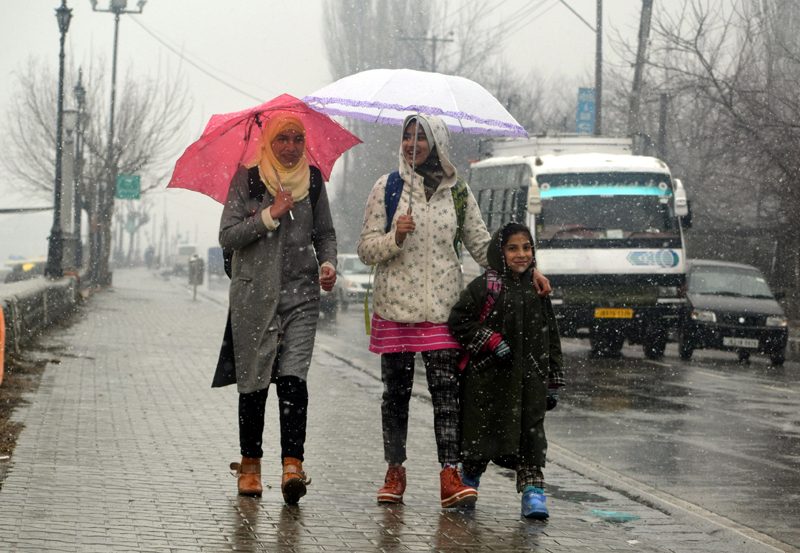 People walk amid fresh snowfall in Srinagar on Thursday. -Excelsior/Shakeel