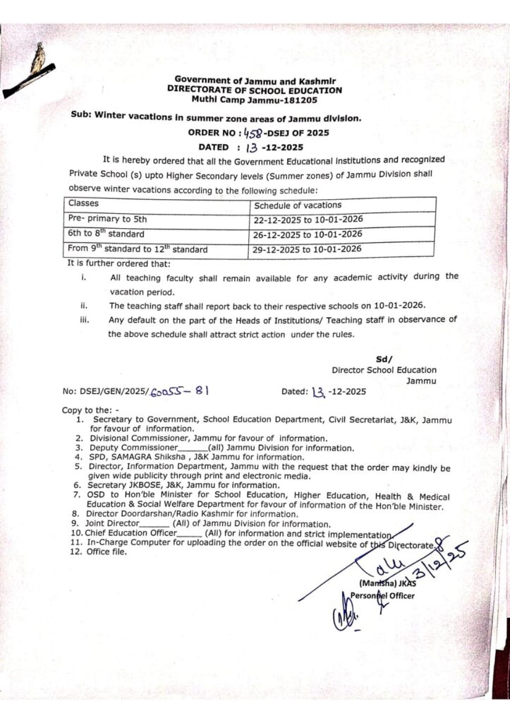 JAMMU, Dec 13: The Directorate of School Education Jammu (DSEJ) has announced winter vacations for all government and recognised private schools falling in the summer zone areas of Jammu Division, as per an official order issued on Saturday.