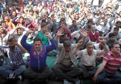 A large number of workers under the leadership of Tanveer Hussain  assembled at PHE complex in the morning and started protest demonstration followed by day long dharna. The workers from various districts  and PHE divisions from Kathua, Samba, Jammu, Udhampur and Reasi  participated in the programme.