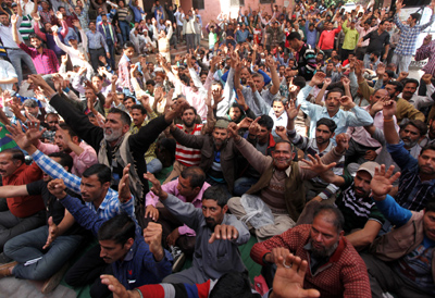 JAMMU, Mar 26: The daily rated, ITI trained and community participation workers of the PHE department held protest demonstration against the State Government at B C Road office complex on the 13th consecutive day here today.