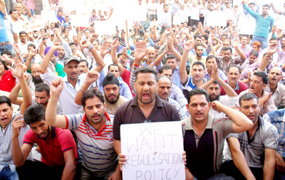 A large number of workers under the banner of All J&K PHE, ITI Trained & CP Workers Association headed by its provincial president, Tanveer Hussain assembled at BC Road office of the Chief Engineer here in the morning and started protest demonstration against the higher authorities.
