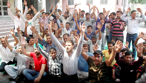 A large number of temporary workers under the leadership of Tanveer Hussain, Union leader held protest dharna at PHE Divisional office here. They were staging strong protest demonstration against the Government. The workers have suspended entire work in the region. The department is facing difficulty to maintain supply to the public as only permanent staff is performing duty and they are over burdened. The Government has turned mute spectator. It is least bothered to find a way out to ensure water supply during these hot summer days.