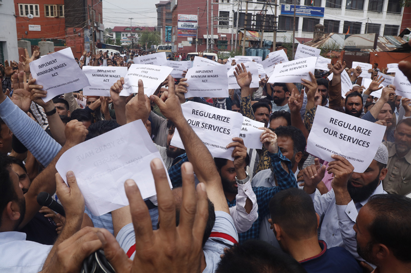 Srinagar, Sept 12: The casual, daily wagers of the PHE Department today staged a protest here demanding immediate regularization of their services as well as the release of their pending wages for the last several months.