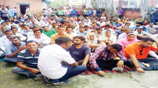 PHE daily wagers staging protest demonstration at Udhampur on Friday.
