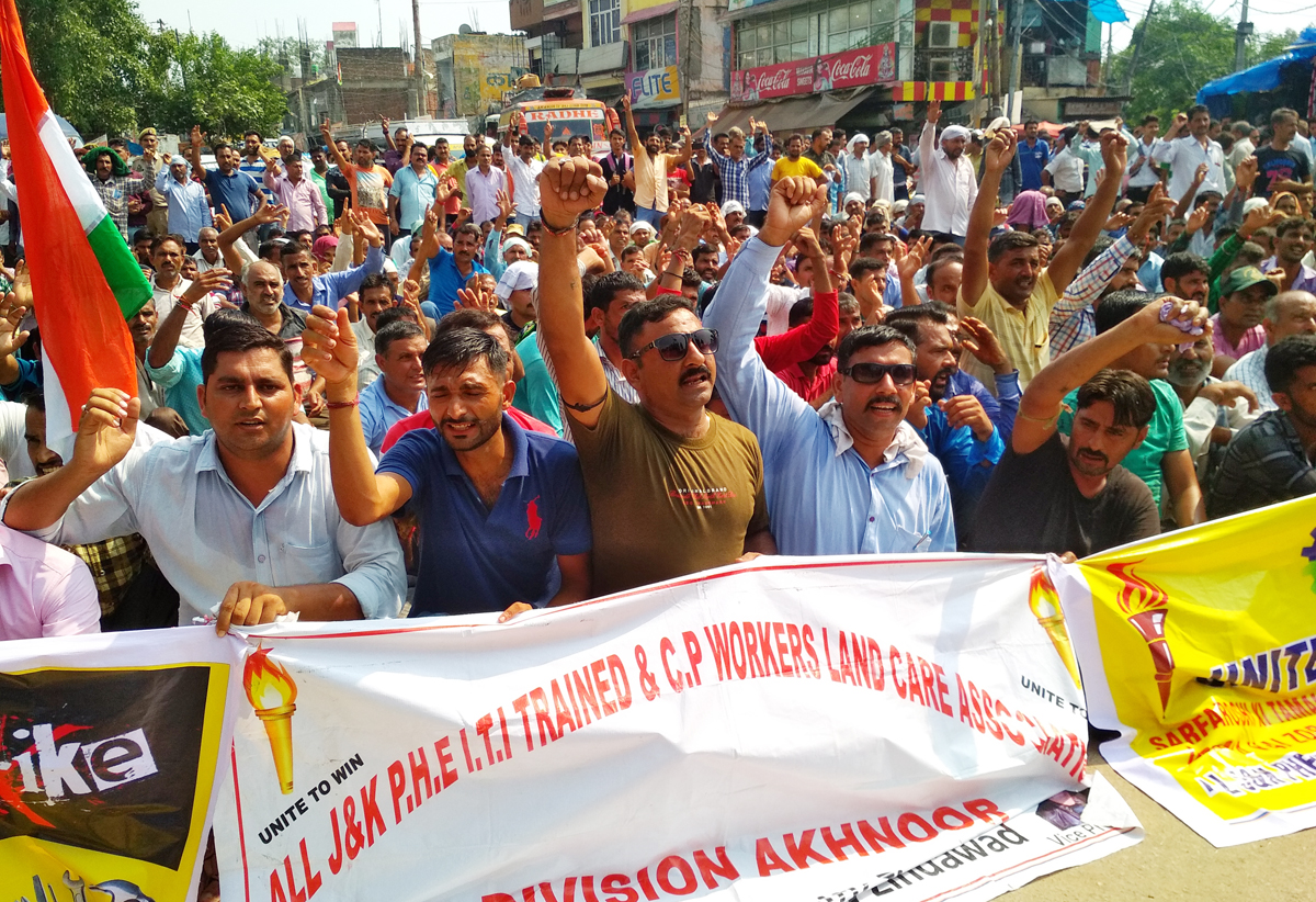 PHE daily wagers take out protest rally at Akhnoor By Daily Excelsior - September 11, 2018 Share FacebookTwitterWhatsAppPinterestLinkedinCopy URLTelegramEmailTumblrReddItPrintKoo PHE daily wagers taking out protest rally in Akhnoor on Monday. Follow our WhatsApp channel