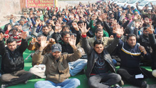 PHE ITI trained workers raising slogans during protest at Jammu on Tuesday.                  -Excelsior/ Rakesh