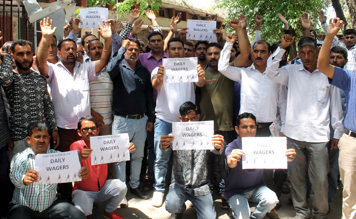 JAMMU, Apr 22: The daily rated, consolidated and ITI trained workers of PHE department held strong protest demonstration at Press Club here today.