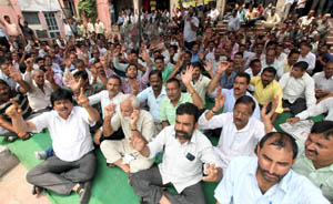The agitating employees were shouting slogans against the BJP-PDP Coalition Government, PHE Minister  and  Chief Engineer concerned for not addressing the long pending issues of the  employees and workers of all the categories. They alleged that despite assurance, the Minister for PHE and Irrigation  Sham Choudhary has not responded to the commitment made by him with the Association members.