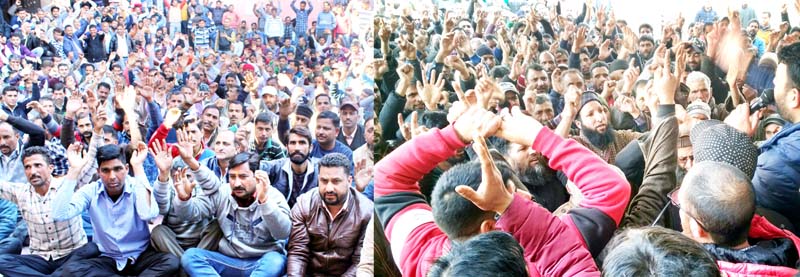 The PHE workers are on strike under the banner of PHE Employees United Front, Jammu province since February 7. Today was the 11th day of their strike. The workers are sitting on protest dharna in the office of Chief Engineer, PHE, BC Road complex besides other district and Sub Divisional headquarters. They are demanding release of their pending wages of 58 months, regularization of DRWs, conduct of DPC of all cadre, filling up of vacant posts, repair/ maintenance of pumping houses/ water stations and basic facilities at water stations for the staff. They held strong protest demonstration against Govt today.