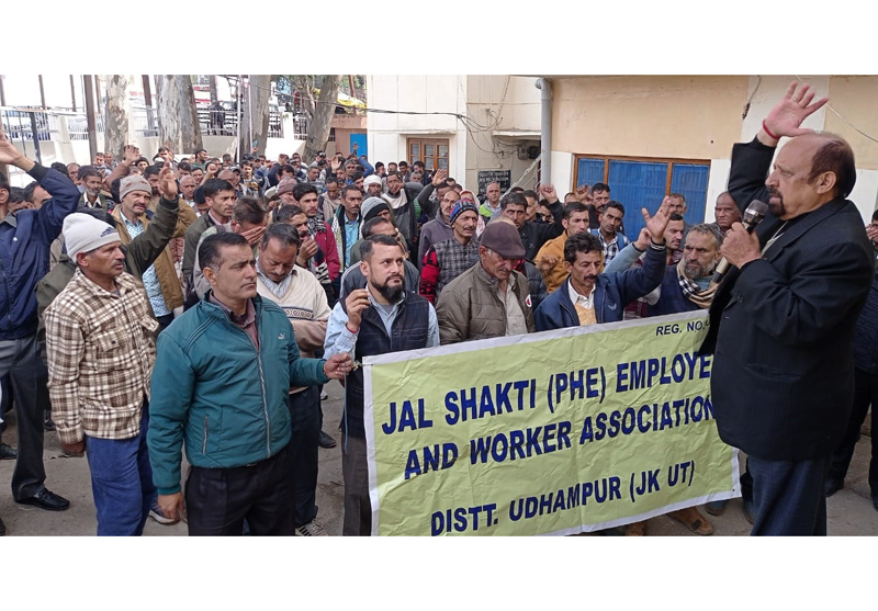 The employees and workers from Ramnagar, Majalta, Khoon, Mansar, Krimchi, Jib Thathi, Garhi /Rehmble, Chenani, Kud and far flung areas of District Udhampur assembled at PHE Complex here on Monday and started protest demonstration. They were shouting slogans in support of their demands.