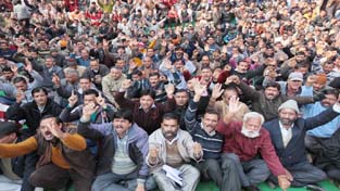 PHE workers staging protest outside Chief Engineer’s office  at B C Road in Jammu on Friday.