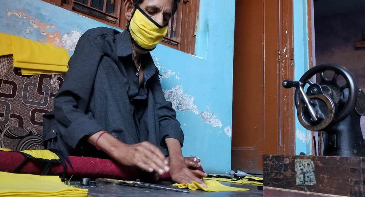 Physically challenged Madan Lal sewing face masks free of cost for needy.