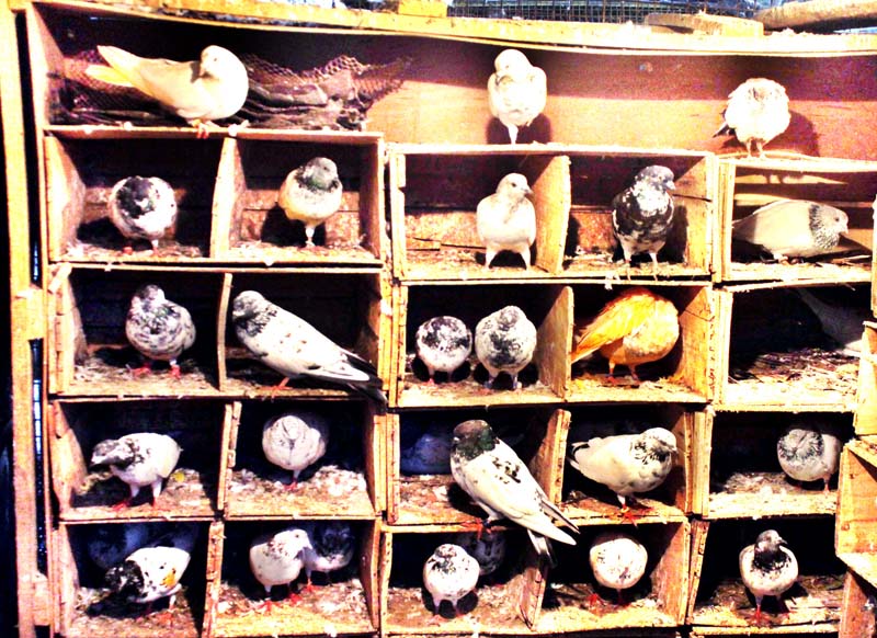 Pigeons resting in a man made coop in Jammu on Thursday, as many bird lovers keep pigeons and sparrows for sale in bird farms. (UNI)