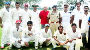 Players of JKP cricket XI posing for Photograph with SSP Traffic Mohan Lal after winning match at GGM Science College Cricket ground on Saturday.