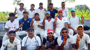 Players of Media-XI Cricket Club Jammu posing for group photograph after winning friendly match against BCC at Phallian Mandal ground on Saturday.