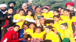 Players of Platinum Women’s Club receiving title trophy from dignitaries at KK Hakku Stadium, Jammu on Monday.-Excelsior/Rakesh