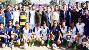 Players posing along with Minister for Education, Altaf Bukhari and Minister for Sports, Imran Raza Ansari during inauguration of Cluster Universities Tourney.