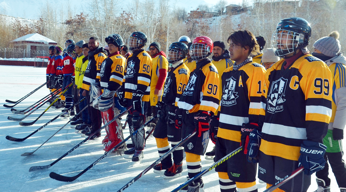Players posing for group photograph during inagural ceremony of Ice Hockey tournament at Kargil on Wednesday.