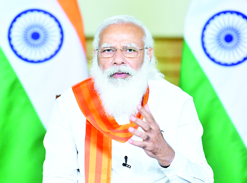 Prime Minister Narendra Modi chairing the meeting of the High Level Committee to commemorate 400th Birth Anniversary (Prakash Purab) of Sri Guru Tegh Bahadur Ji, though video conferencing, in New Delhi on Thursday. (UNI)