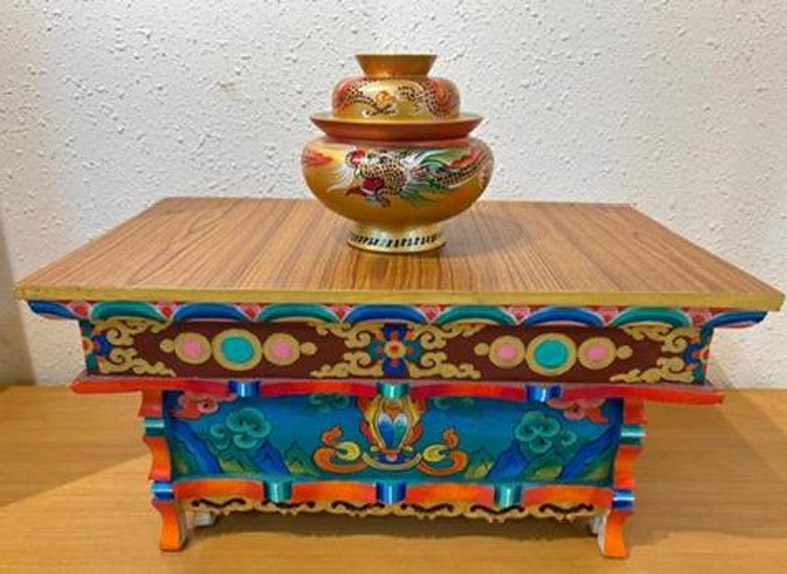These tables are painted in vibrant colors–rich reds, blues, greens, and yellows–giving them an energetic presence that brightens any room. The detailed brushwork and symbolic color choices mirror the spirituality and natural beauty of the Ladakh region.