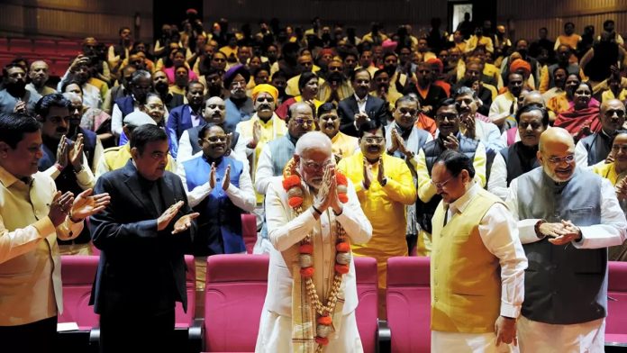 New Delhi, Dec 7: Prime Minister Narendra Modi was given a standing ovation at the BJP Parliamentary Party meeting on Thursday following the party’s stupendous win in three assembly polls.
