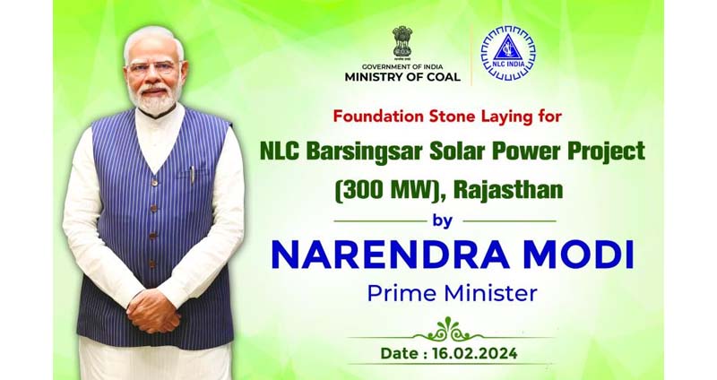 NEW DELHI, Feb 16 : Prime Minister Narendra Modi on Friday laid the foundation stone for NLC India Ltd’s 300-mw solar power project in Barsingsar, Rajasthan.