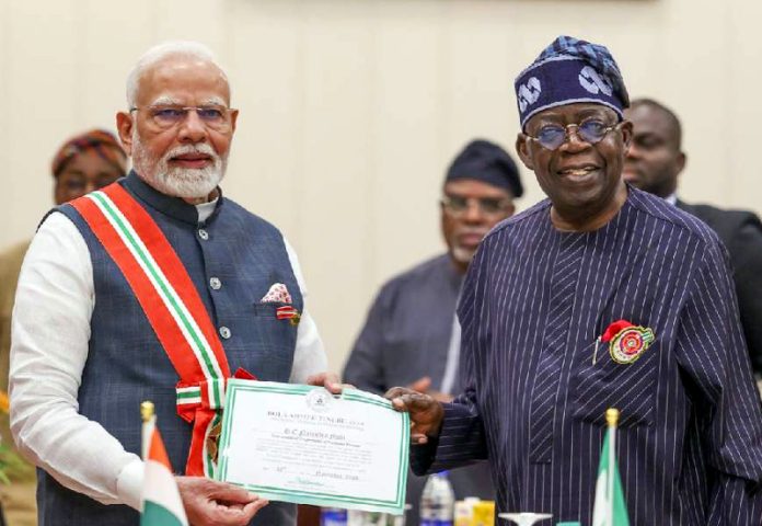 ABUJA, Nov 17 : Nigeria on Sunday conferred its second-highest national award – the Grand Commander of the Order of the Niger – on Prime Minister Narendra Modi, making him the second foreign dignitary to receive the distinction.
