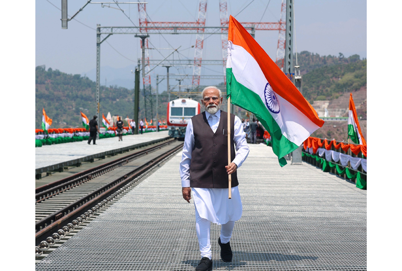 PM Narendra Modi carrying Tricolor walking on rail bridge over river Chenab in Reasi. By Daily Excelsior - June 7, 2025 Share FacebookTwitterWhatsAppPinterestLinkedinCopy URLTelegramEmailTumblrReddItPrintKoo PM Narendra Modi carrying Tricolor walking on rail bridge over river Chenab in Reasi. PM Narendra Modi carrying Tricolor walking on rail bridge over river Chenab in Reasi. Follow our WhatsApp channel