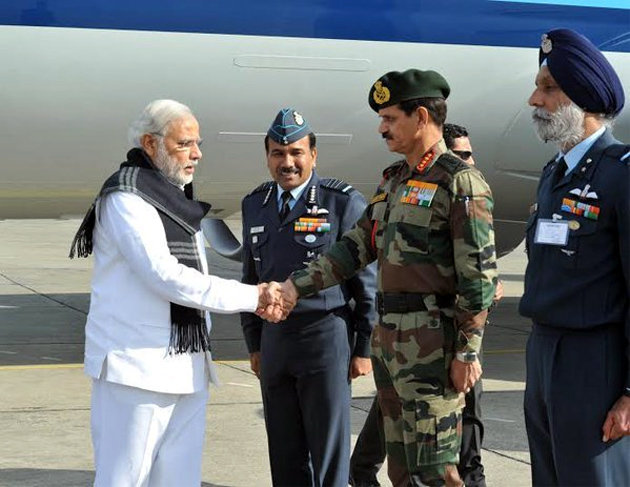PM Narendra Modi was received by the Chiefs of Defence Forces on his arrival at Pathankot Airbase today By Daily Excelsior - January 9, 2016 Share FacebookTwitterWhatsAppPinterestLinkedinCopy URLTelegramEmailTumblrReddItPrintKoo Follow our WhatsApp channel