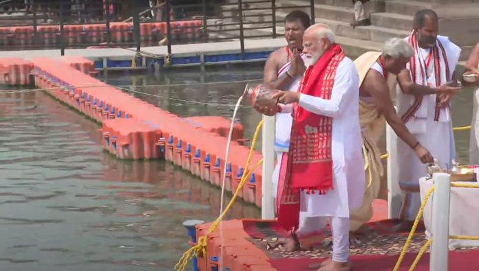 VARANASI, May 14: Prime Minister Narendra Modi offered prayers at the Dashashwamedh Ghat on the banks of the Ganga here on Tuesday before filing his nomination from the Varanasi Lok Sabha constituency.
