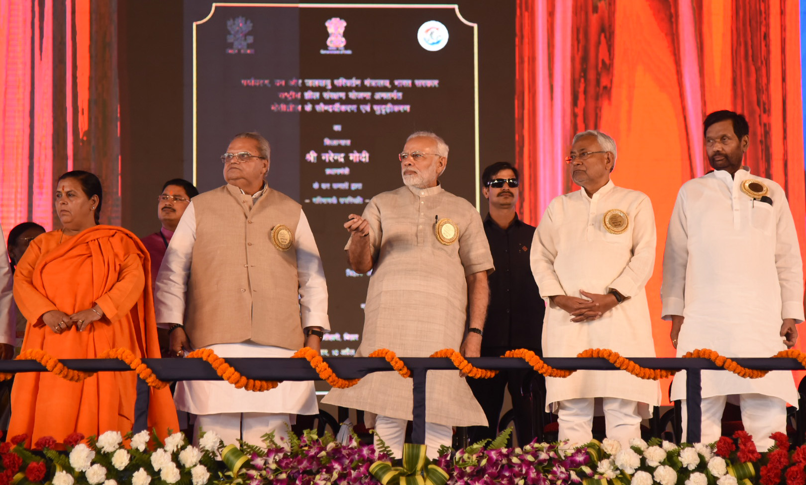 Those who shared the dais with the Prime Minister today included the CM, the Deputy CM, Bihar Governor Satya Pal Mallik and Union ministers Ram Vilas Paswan, Uma Bharati, Ravi Shankar Prasad, Radha Mohan Singh, Giriraj Singh, Ashwini Kumar Choubey and S S Ahluwalia. (PTI)