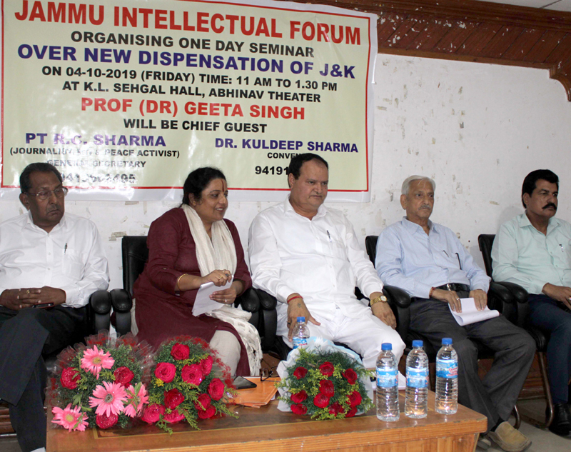 Dr Kuldeep Sharma convener of the Forum said the rights of Jammu people will not be usurped under new arrangement. He said the seminar was organised to allay the fears of the people of Jammu that they will lose jobs and land as the same will be snatched by outsiders and no outsider will come here to contest the elections. He said a memorandum was handed over Dr Geeta Singh to be presented to Union Government.
