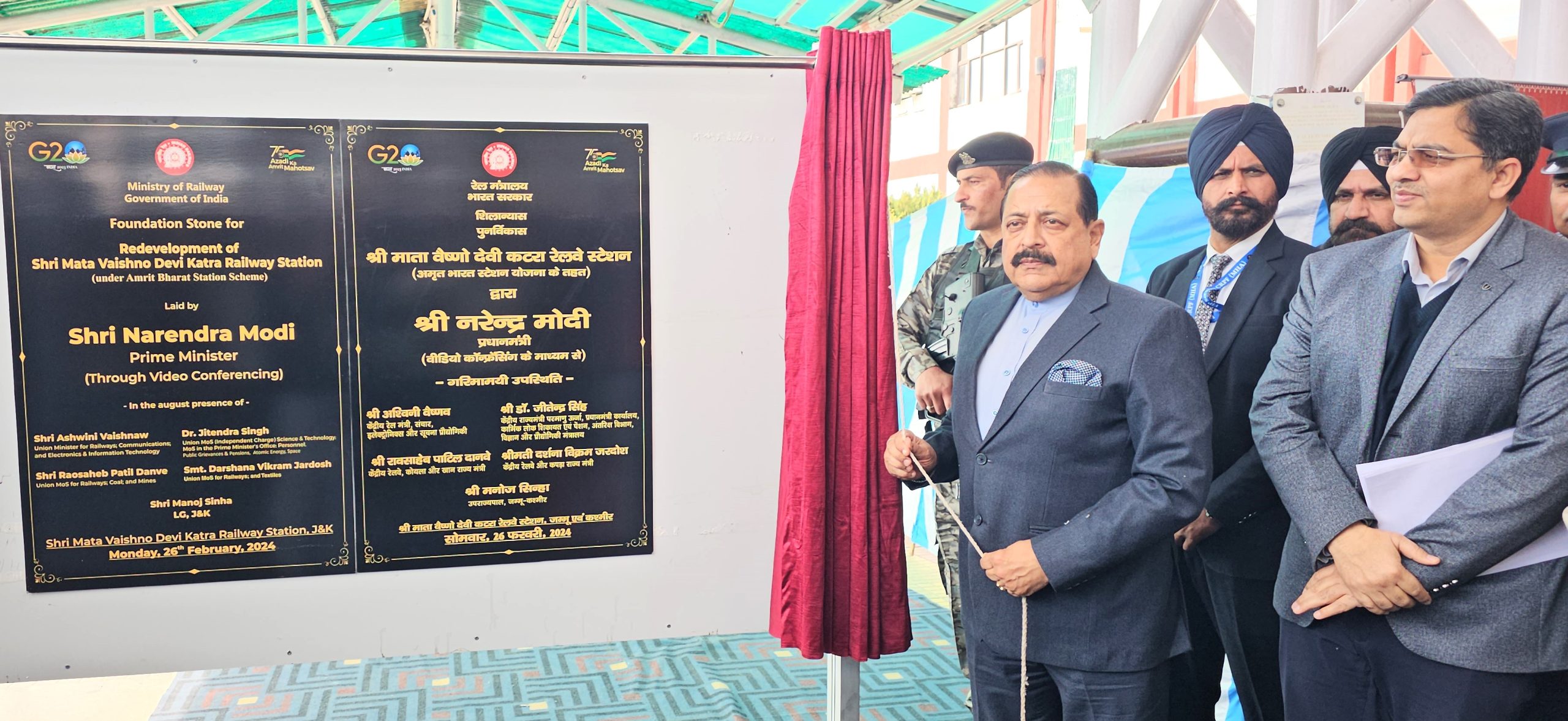 KATRA, Feb 26 : In a historic decision, Mata Vaishno Devi Railway Station in Katra city of Reasi district in the Union Territory of Jammu and Kashmir will be redeveloped at a cost of 40 crore rupees to enhance the existing facilities and introduce new amenities for passengers. The step is part of the Amrit Bharat Station Scheme under which Prime Minister Narendra Modi today laid the foundation stone for redevelopment of 553 railway stations across the country at a cost of over 19,000 crore rupees. To mark the occasion, Union Minister Dr Jitendra Singh unveiled a plaque marking a formal redevelopment of the Mata Vaishno Devi Railway Station today.