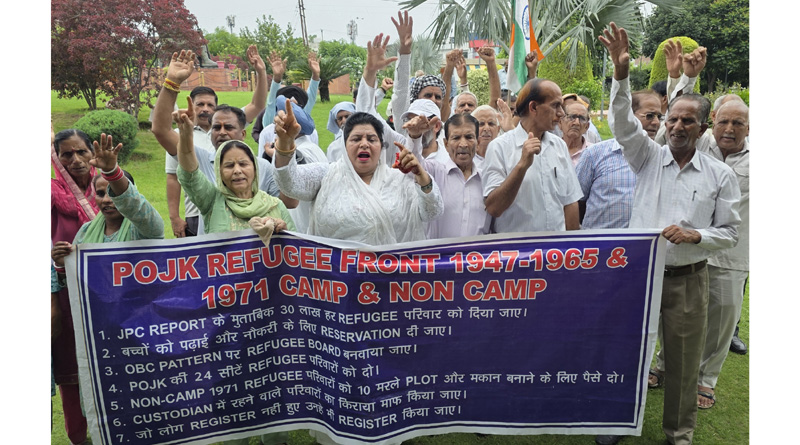 JAMMU, July 24: Pressing their demands, members of PoJK DPs’ Front held a protest demonstration at Mahraja Hari Singh Park, here today, under the leadership of Captain (Retd) Yudhvir Singh Chib.