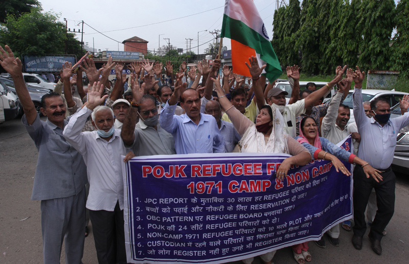 JAMMU, July 26: The displaced persons from Pak occupied Jammu and Kashmir (PoJK) today held protest demonstration and demanded release of pending relief package of Rs 24.50 lakh in favour of displaced families as per JPC recommendations.