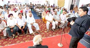SOS Intl chairman Rajiv Chuni addressing DPs during a meeting at Rehari in Jammu on Sunday. -Excelsior/Rakesh