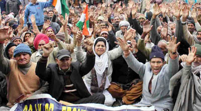 The displaced people from Chhamb, Deva-Batala, Manawar, Mirpur, Kotli, Bagh, parts of Poonch and Muzaffrabad, including large number of women, under the banner of PoK Refugee Front-1947, 65 and 71 assembled at Maheshpura Chowk here at around 10.30 am and held demonstration in support of their demands.