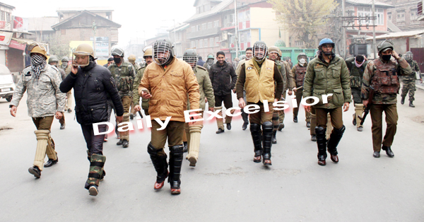 Police and paramilitary personnel patrolling Jama Masjid area to maintain law and order after Friday prayers. Excelsior/Shakeel-ul-Rehman