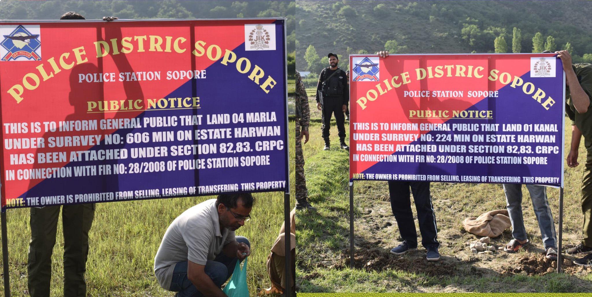 Police said in a non-kinetic operation, Sopore Police today attached 29 marlas of land belonging to Arshid Ahmad Teli of Nowpora Tujjar; Firdous Ahmad Dar alias Umar Dar and Nazir Ahmad Dar alias Shabir Illahi- both residents of Harwan.