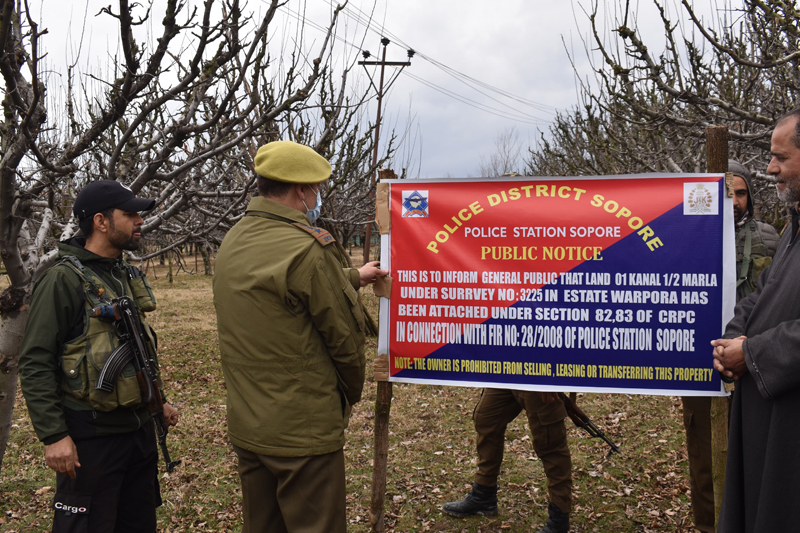 SRINAGAR, Feb 20: Police in Sopore today attached 4 kanals and 2 marlas of orchard land belonging to two proclaimed offenders in Warpora area of Sopore of Baramulla district.
