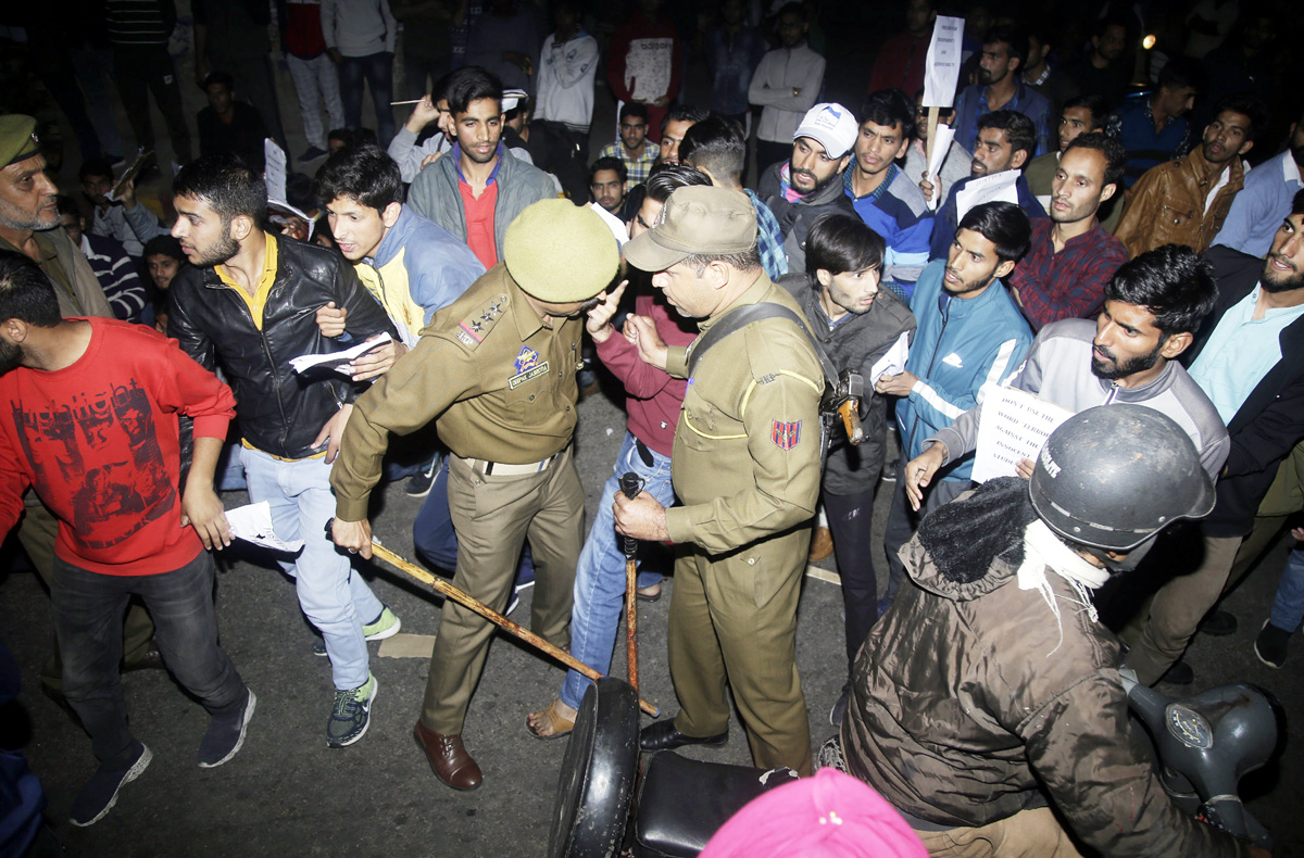 JAMMU, Nov 18: Police cane charged the protesting inmates of Gujjar Hostel near GGM Science College as they blocked the vehicular movement on the road to highlight their issues.