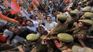 The protestors with party flags in their hands were raising slogans against the Coalition Government for its failure to end discrimination with Jammu and Ladakh regions and contain rising prices in the State which have broken the back of common man. The police had erected barricades at Ranbireshwar Chowk and it did not allow any one to proceed ahead. This resulted into a scuffle between BJP activists and police. A high drama prevailed at Ranbireshwar Chowk for some time and the party activists jostled with men in Khaki in their bid to break police cordon.