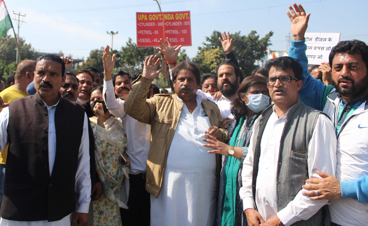 Senior Congress leaders including former Minister Raman Bhalla, Manmohan Singh, NSUI J&K president Sunny Parihar, Rajneesh Sharma, Gurdarshan Singh, Sanjeev Panda, Rajveer Singh, District president Jammu Rural Hari Singh Chib today led a strong protest at Maheshpura Chowk over rising prices of petrol, diesel and cooking gas as a part of Congress Party’s nationwide protests against BJP Govt.