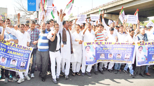 Raising loud slogans of ‘Rohingyas, Bangladeshis Quit Jammu’ and ‘Bharat Mata Ki Jai’, a large number of Panthers Party workers took out a large rally in the heart of the Jammu city today which was spearheaded by Harsh Dev Singh, chairman of the party, Balwant Singh Mankotia State president and Yash Paul Kundal State president Young Panthers and other leaders.