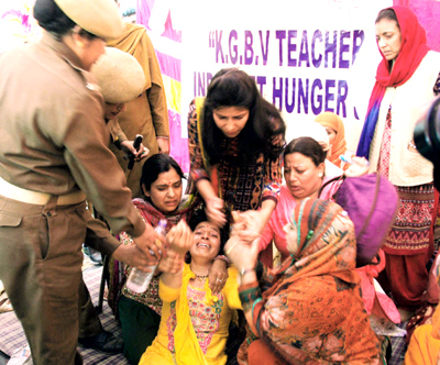 The high voltage drama took place this afternoon when the agitating KGBV female teachers were protesting at the venue of chain hunger strike near Press Club Jammu.