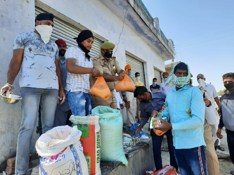 Police personnel and civilians distribute ration among needy persons in Ramgarh area of Samba district on Wednesday. — Excelsior/Abhishek Badyal