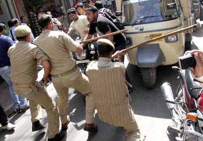 JAMMU, Oct 9: Police today resorted to cane- charge to disperse the activists of a newly-formed party, demanding release of their three members, who were arrested after they created chaos in the Jammu and Kashmir Assembly for the implementation of employment policy.