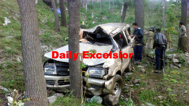 Policemen and civilians searching vehicle badly damaged in accident at Shaitaninalla near Banihal on Sunday morning. In the accident, two persons lost their lives and 7 others sustained injuries. Excelsior/Parvez