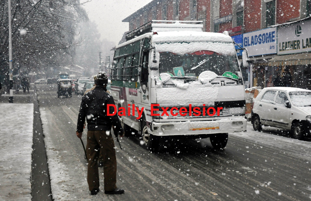 Policemen patrols in Srinagar during Passenger Bus ply on a road at Residence Road Srinagar as fresh snow-fall in Srinagar , on Monday . The 300-Km long Srinagar- Jammu National Highway closed due to heavy Snow fall and landslides and rain in Kashmir valley. ..Excelsior/Mohd Amin war