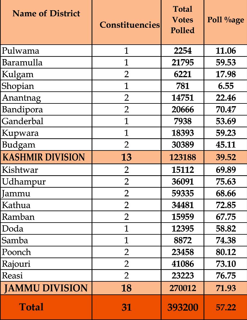 In Jammu region, voting percentage was 64 in Phase-I which went up to 65.5 in second phase, 68.8 in third and 69.3 in fourth before coming down to 66.6 in fifth but again rose to 68.5 in sixth and was the highest in seventh phase today at 71.9.